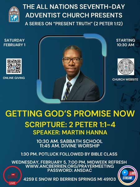 Join us for our worship experience this Saturday, February 1 @ 11:45 am as Martin Hanna presents "Getting God's Promise Now." Adult and Children's Sabbath School begins @ 10:30 am. Lunch is provided followed by Bible Class. All...