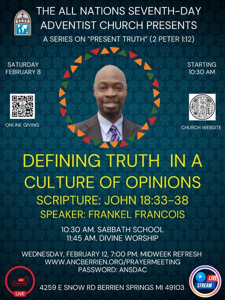 Join us for our worship experience this Saturday, February 8 @ 11:45 am as Frankel Francois presents "Defining Truth in a Culture of Opinions." Adult and Children's Sabbath School begins @ 10:30 am. We look forward to seeing...