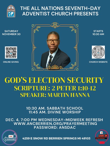 Join the All Nations Seventh-day Adventist Church for our worship experience this Saturday, Nov. 30, at 11:45 a.m. as Martin Hanna presents "God's Election Security." Adult and Children's Sabbath School begins at 10:30 a.m. We look forward to...