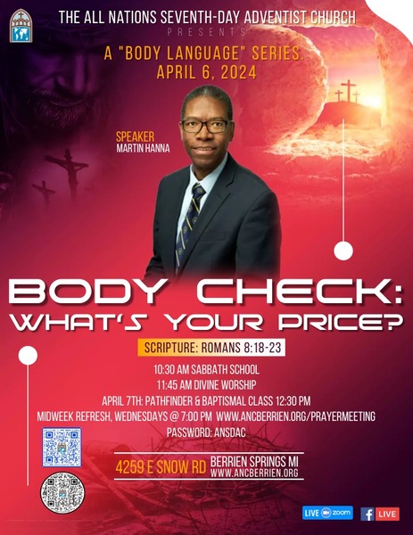 Join the All Nations SDA Church for an uplifting worship experience this Saturday, April 6, at 11:45 a.m. as Martin Hanna presents "Body Check: What's Your Price?" Adult and Children's Sabbath School begins at 10:30 a.m. We look forward...