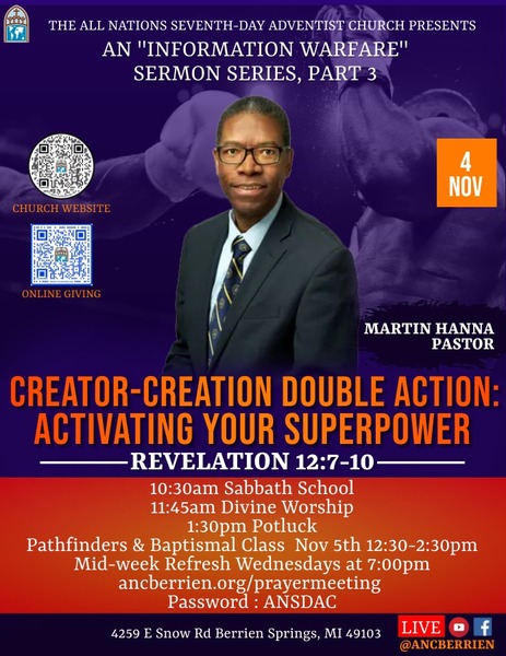 Join us this Sabbath, November 4, at 11:45 a.m. for a powerful worship experience as Martin Hanna presents "Creator-Creation Double Action: Activating Your Superpower." There will be a fellowship meal directly after service. All are welcome! ...