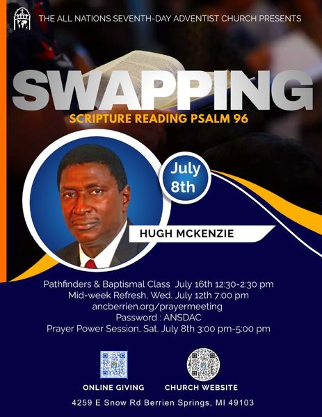 Join the All Nations Church Family for an uplifting worship experience this Sabbath, July 8, at 11:45 a.m. Hugh McKenzie will present on "Swapping." Adult and Children's Sabbath School begins at 10:30 a.m. We are at 4259 E....