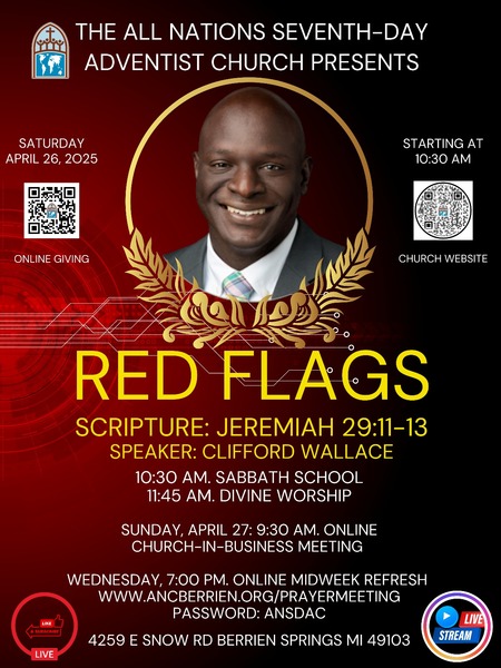 Join the All Nations Seventh-day Adventist Church for our worship experience this Saturday, April 26, at 11:45 a.m. as Clifford Wallace presents "Red Flags." Adult and Children's Sabbath School begins at 10:30 a.m. Breakfast is served at 10... read more