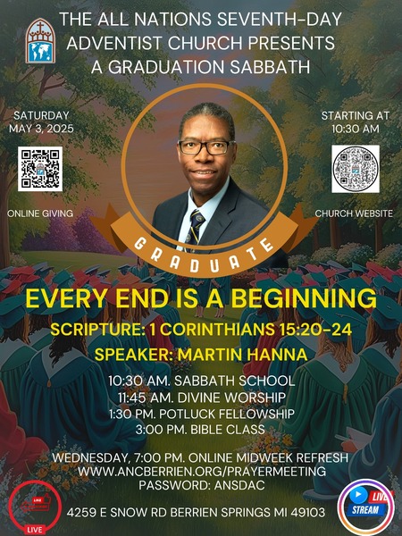 Join us for our graduation worship experience this Saturday, May 3, @ 11:45 am as Martin Hanna presents "Every End Is A Beginning." Adult and Children's Sabbath School begins @ 10:30 am. Lunch is served after the service... read more