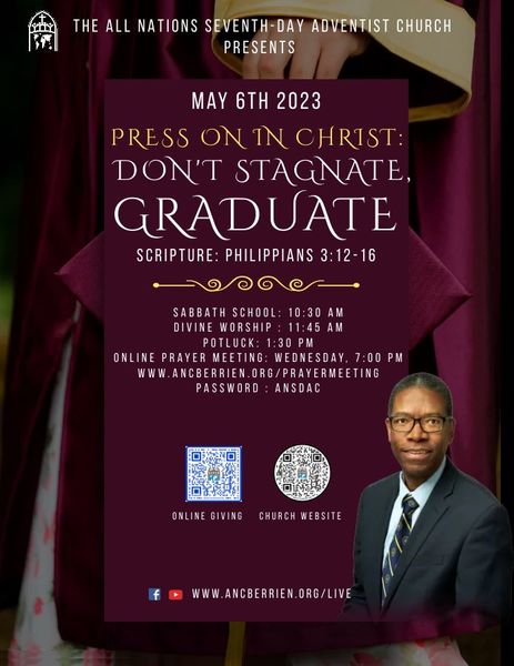 The All Nations Church Family invites you to worship with us as our lead pastor, Martin Hanna speaks on the word "Press on in Christ: Don't Stagnate, Graduate". Adult and children's Sabbath school begins at 10:30 a.m. Divine...