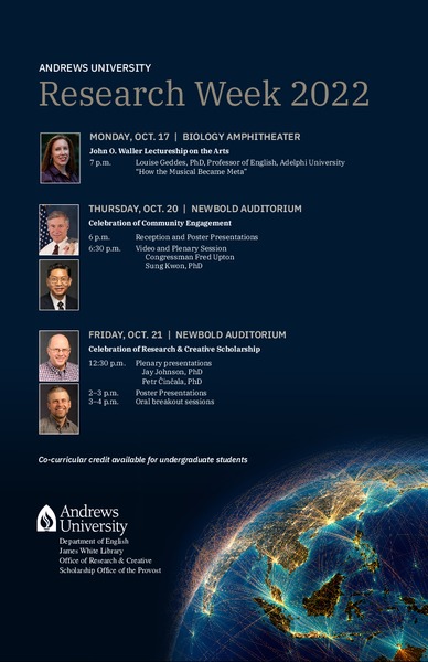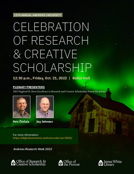The Celebration of Research and Creative Scholarship is a campus-wide event that showcases the culture of research and creative scholarship at Andrews. This year's conference will start at 12:30 p.m. on Friday, Oct. 21, 2022. Jay Johnson and Petr... read more