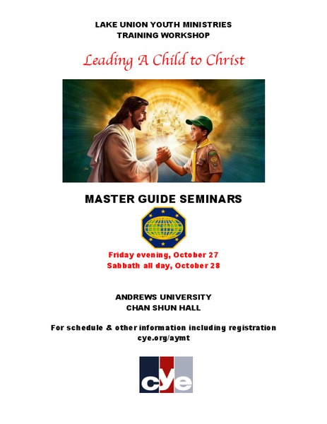 This is the Master Guide Seminar training weekend "Leading A Child to Christ" held in Chan Shun Hall on the campus of Andrews University. Please see cye.org/aymt for the schedule, to register, and to...