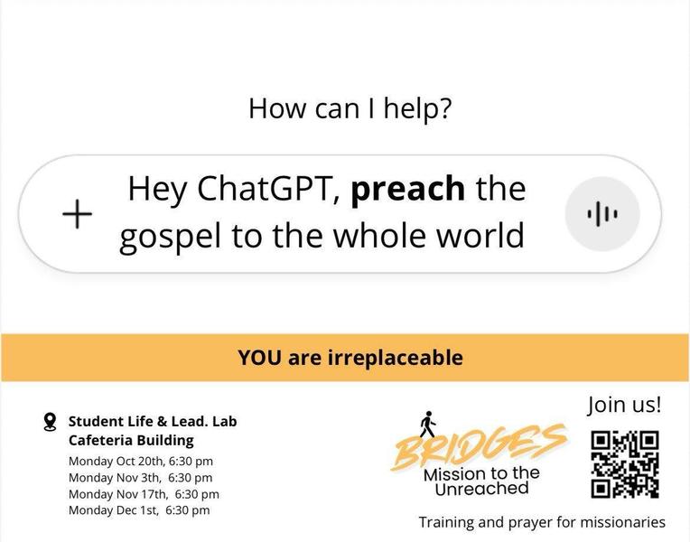 Join us for stories and Q&A about how to connect with people groups outside your own and prayer for missionaries serving right now!  Meetings will take place in the Campus Center Leadership Lab on... read more