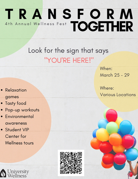 University Wellness presents our 4th Annual Wellness Week, Transform Together! We have a week packed with activities that couldn't fit on the poster! Some activities include pop-up food booths, pop-up workouts, a popcorn stop,... read more