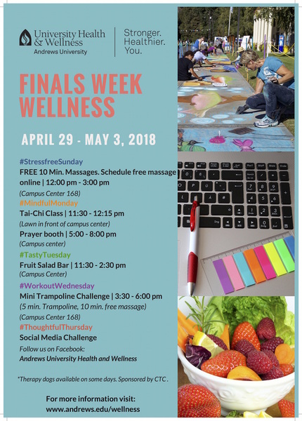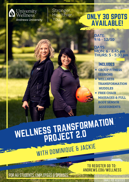 University Wellness is filling 30 spots for the "Wellness Transformation Project 2.0" with Andrews University students, faculty, staff and spouses for Fall Semester 2018. Enrollment in this initiative will require DEDICATED COMMITMENT to all...