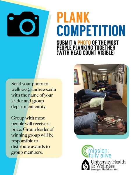 The Gazebo, a made-to-order restaurant located in the Campus Center at Andrews University, had its grand re-opening on Thursday, Oct. 26, as a part of the first ever Wellness Week at Andrews University. Both the week-long event and... read morePlank Competition